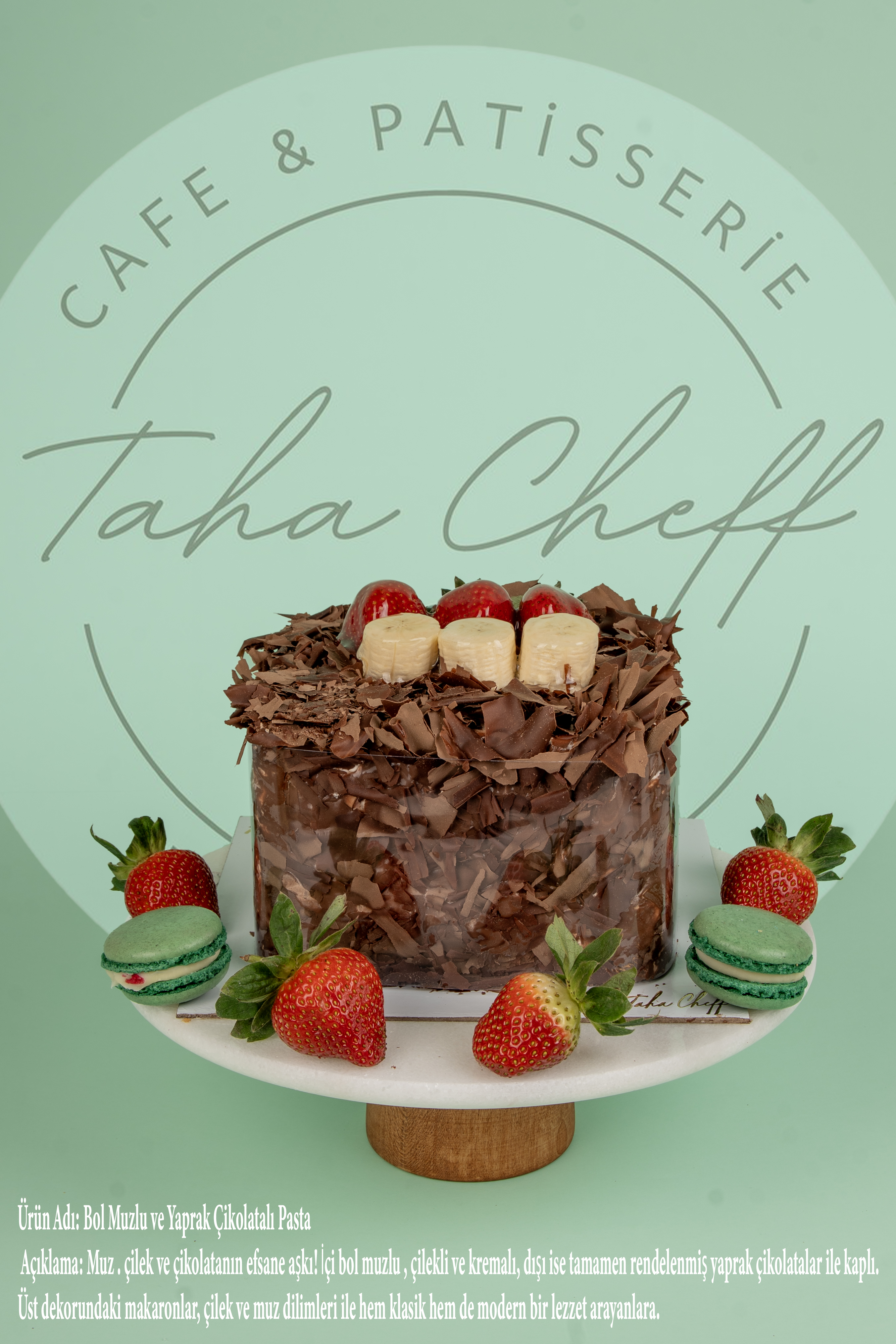 Açıklama: Muz ve çikolatanın efsane aşkı! İçi bol muzlu ve kremalı, dışı ise tamamen rendelenmiş yaprak çikolatalar ile kaplı. Üst dekorundaki makaronlar, çilek ve muz dilimleri ile hem klasik hem de modern bir lezzet arayanlara.