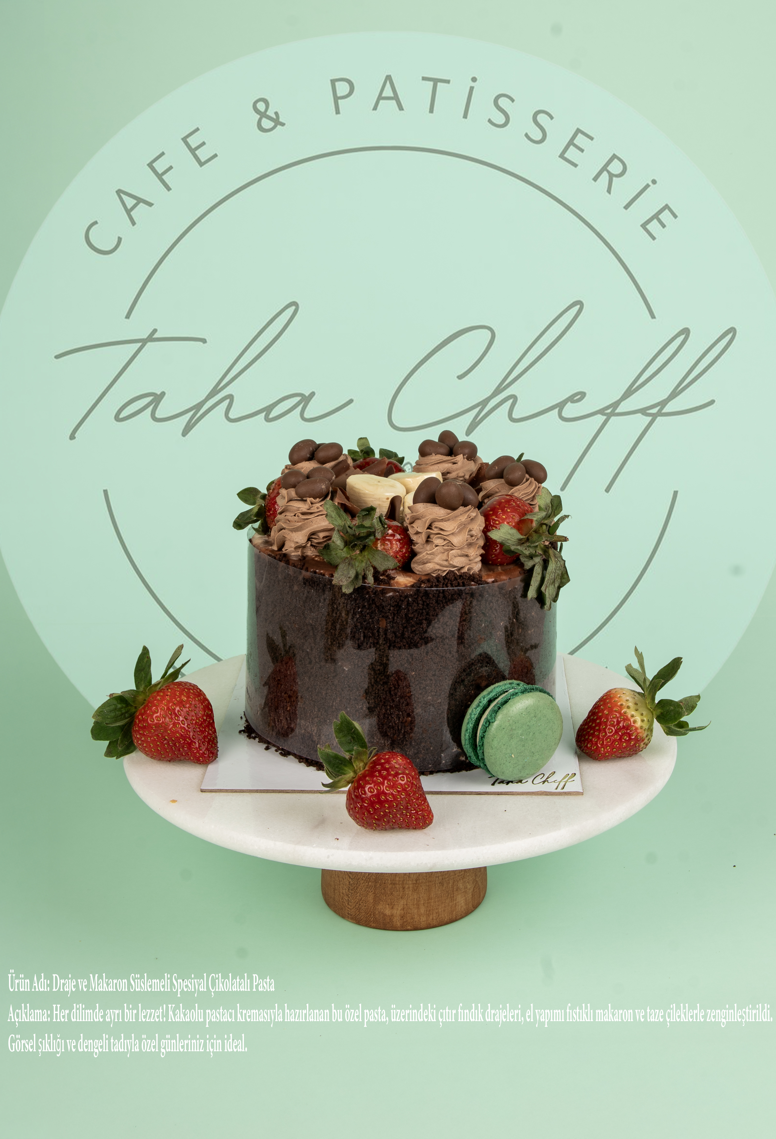 Açıklama: Fıstıklı ve Makaronlu Spesiyal Pasta Açıklama: Çikolatanın en yoğun hali! Yumuşacık kakaolu pandispanya ve zengin iç kreması, dış yüzeyde tamamen bitter çikolata yaprakları (rendeleri) ile kaplandı. Tepe süslemesindeki taze çilekler, yeşil Antep fıstığı serpintisi ve özel pembe makaron dokunuşu ile hem görsel bir şölen hem de lüks bir damak tadı sunuyor. Çikolataya doymak isteyenler için mükemmel tercih.