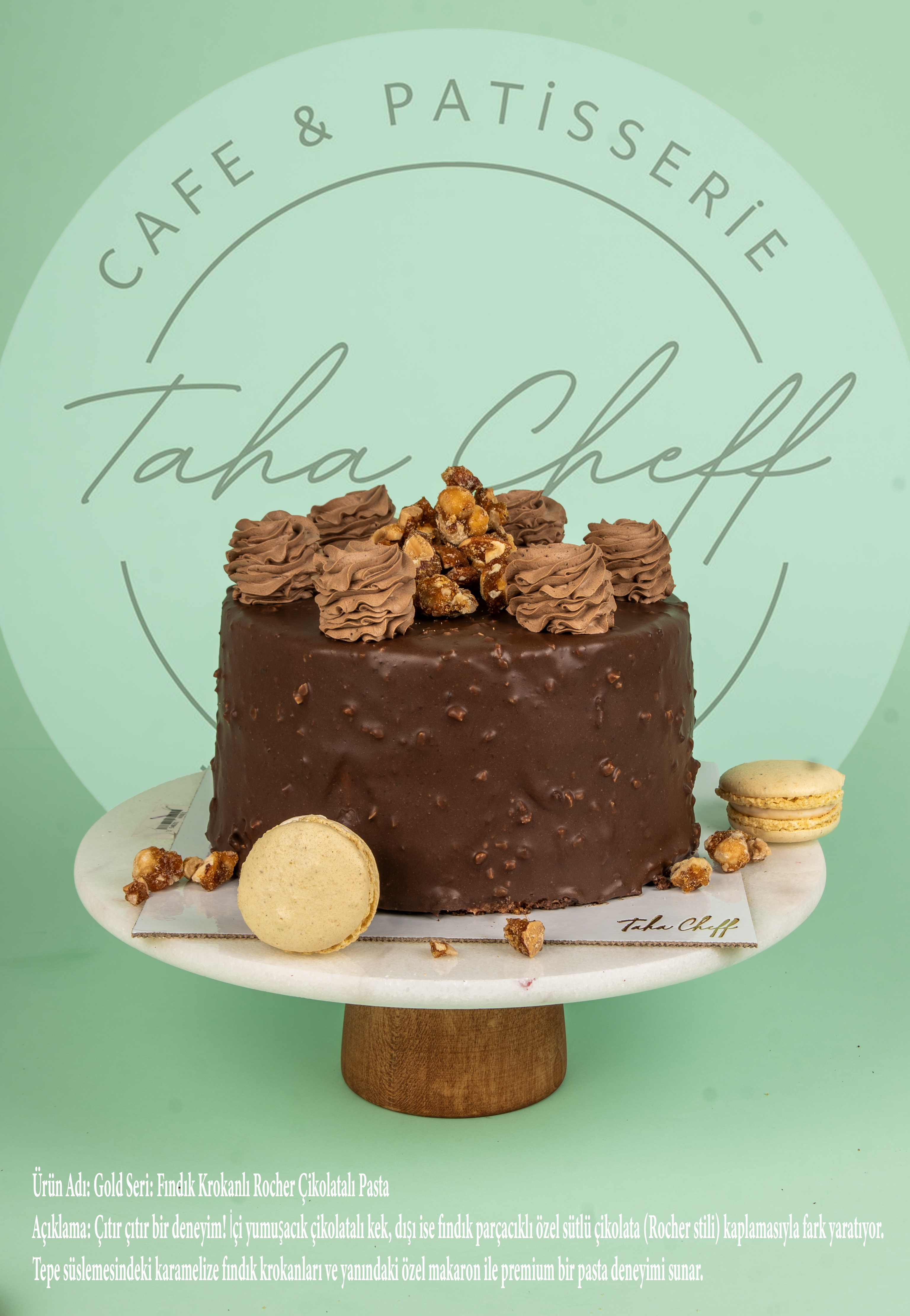 Açıklama: Çıtır çıtır bir deneyim! İçi yumuşacık çikolatalı kek, dışı ise fındık parçacıklı özel sütlü çikolata (Rocher stili) kaplamasıyla fark yaratıyor. Tepe süslemesindeki karamelize fındık krokanları ve yanındaki özel makaron ile premium bir pasta deneyimi sunar.