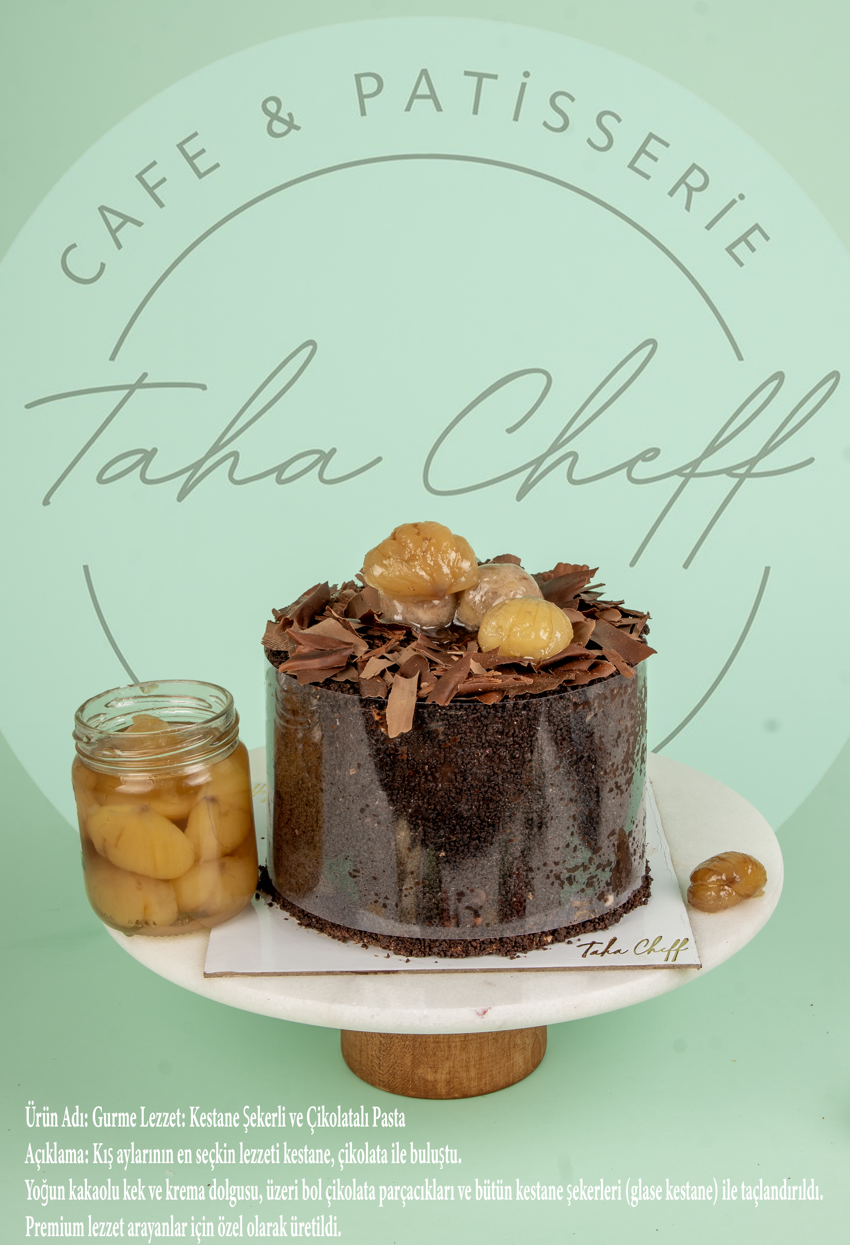 Açıklama: Kış aylarının en seçkin lezzeti kestane, çikolata ile buluştu. Yoğun kakaolu kek ve krema dolgusu, üzeri bol çikolata parçacıkları ve bütün kestane şekerleri (glase kestane) ile taçlandırıldı. Premium lezzet arayanlar için özel olarak üretildi.