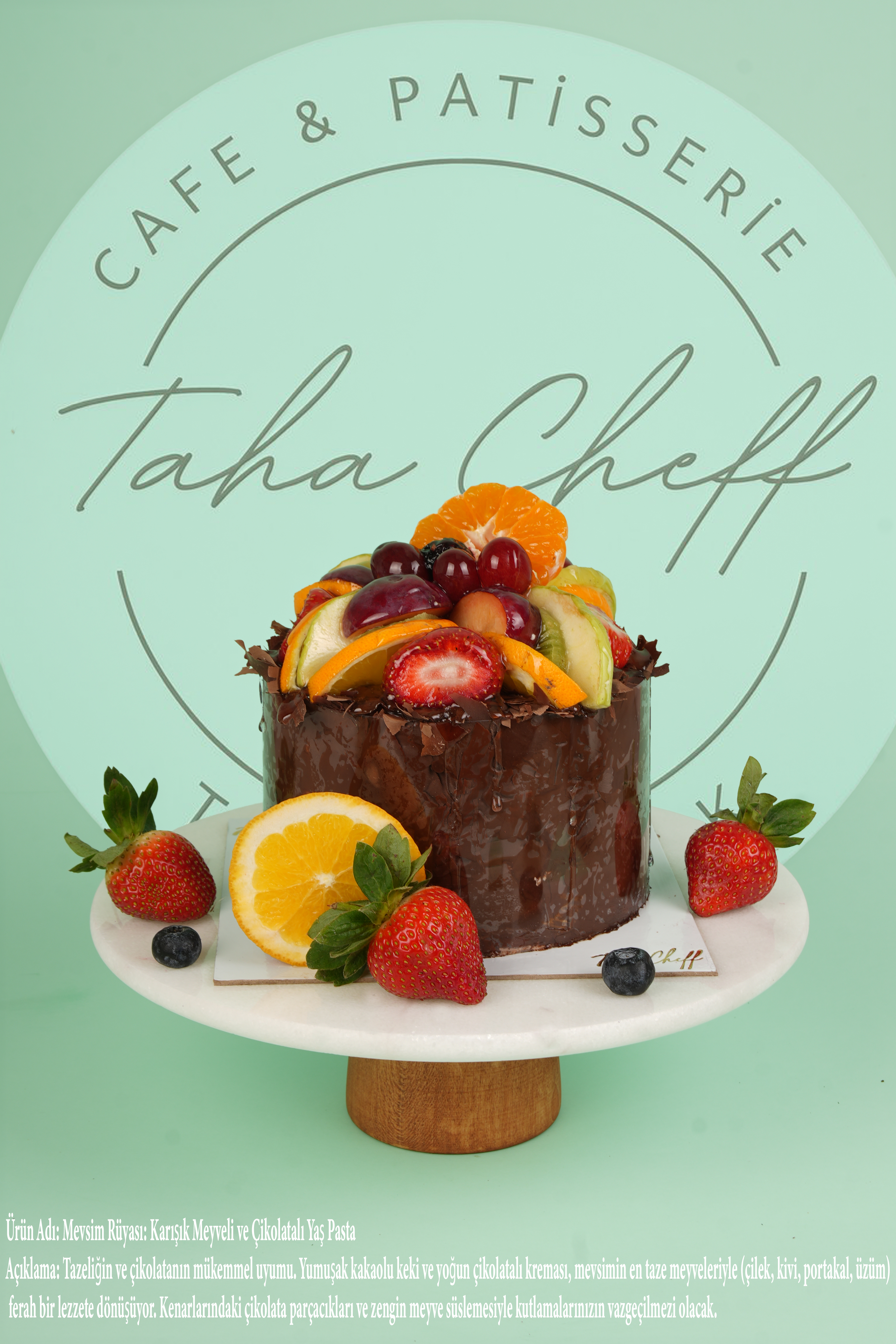 İAçıklama: Tazeliğin ve çikolatanın mükemmel uyumu. Yumuşak kakaolu keki ve yoğun çikolatalı kreması, mevsimin en taze meyveleriyle (çilek, kivi, portakal, üzüm) ferah bir lezzete dönüşüyor. Kenarlarındaki çikolata parçacıkları ve zengin meyve süslemesiyle kutlamalarınızın vazgeçilmezi olacak.
