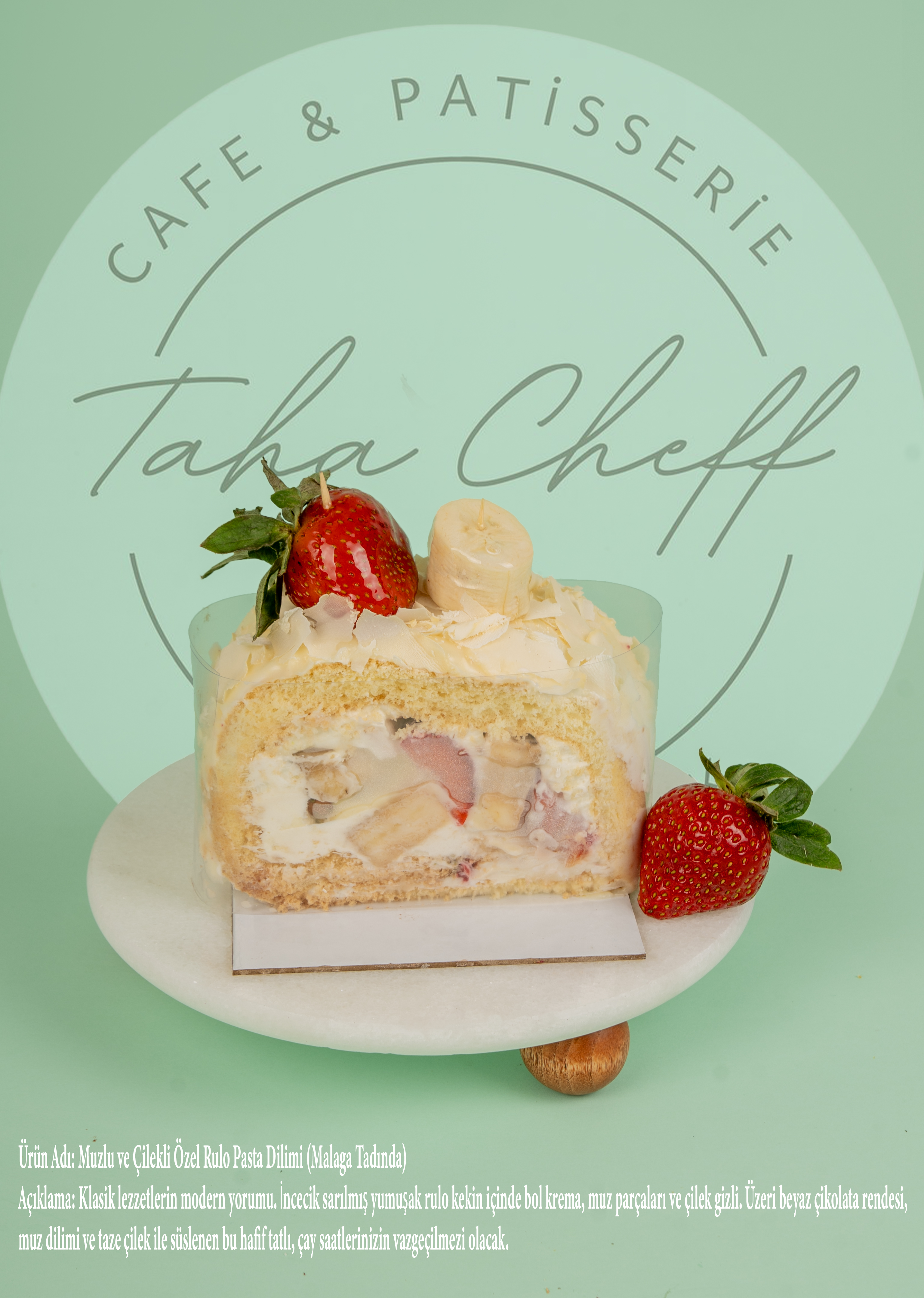 Açıklama: Klasik lezzetlerin modern yorumu. İncecik sarılmış yumuşak rulo kekin içinde bol krema, muz parçaları ve çilek gizli. Üzeri beyaz çikolata rendesi, muz dilimi ve taze çilek ile süslenen bu hafif tatlı, çay saatlerinizin vazgeçilmezi olacak.