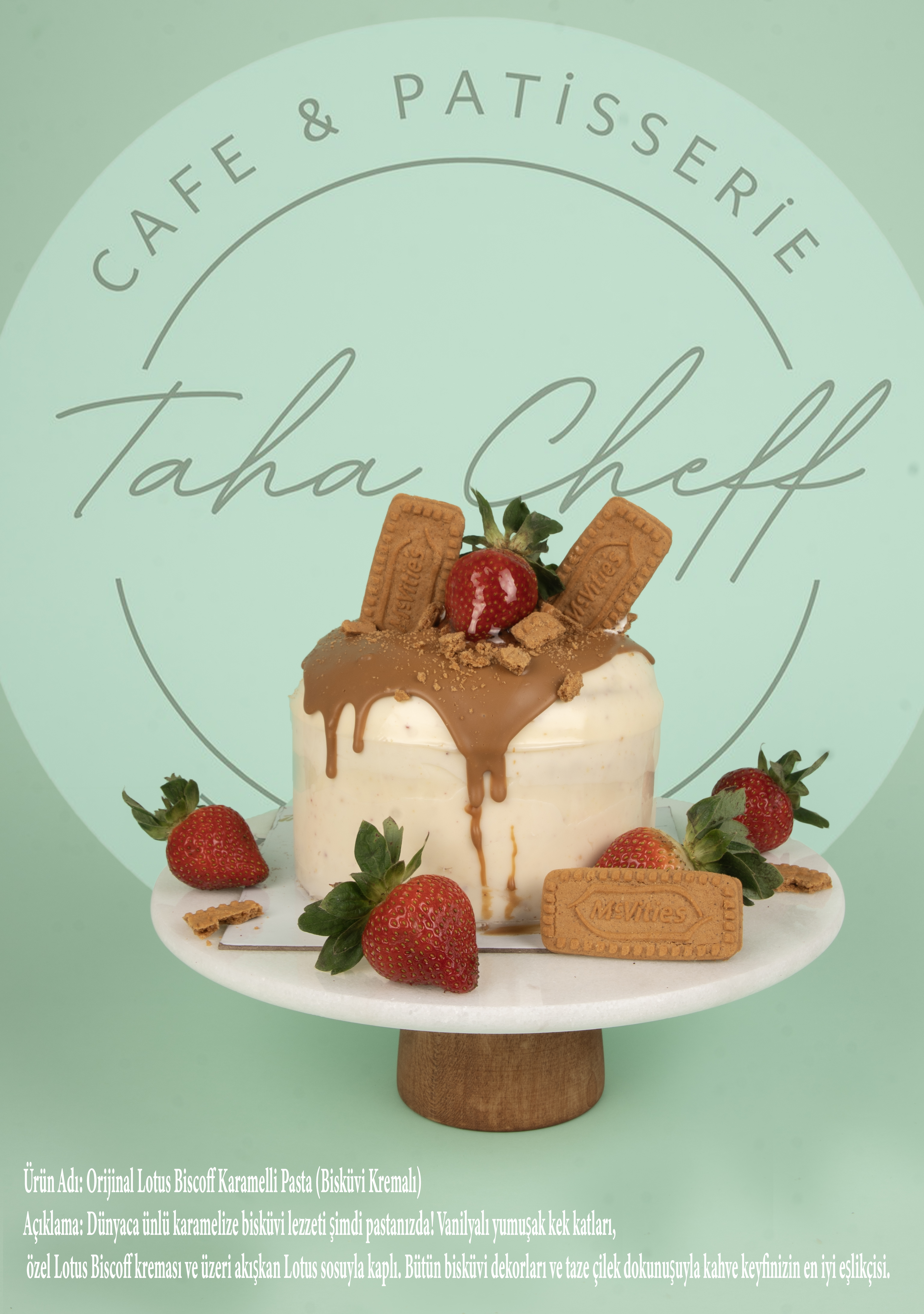 Açıklama: Dünyaca ünlü karamelize bisküvi lezzeti şimdi pastanızda! Vanilyalı yumuşak kek katları, özel Lotus Biscoff kreması ve üzeri akışkan Lotus sosuyla kaplı. Bütün bisküvi dekorları ve taze çilek dokunuşuyla kahve keyfinizin en iyi eşlikçisi.