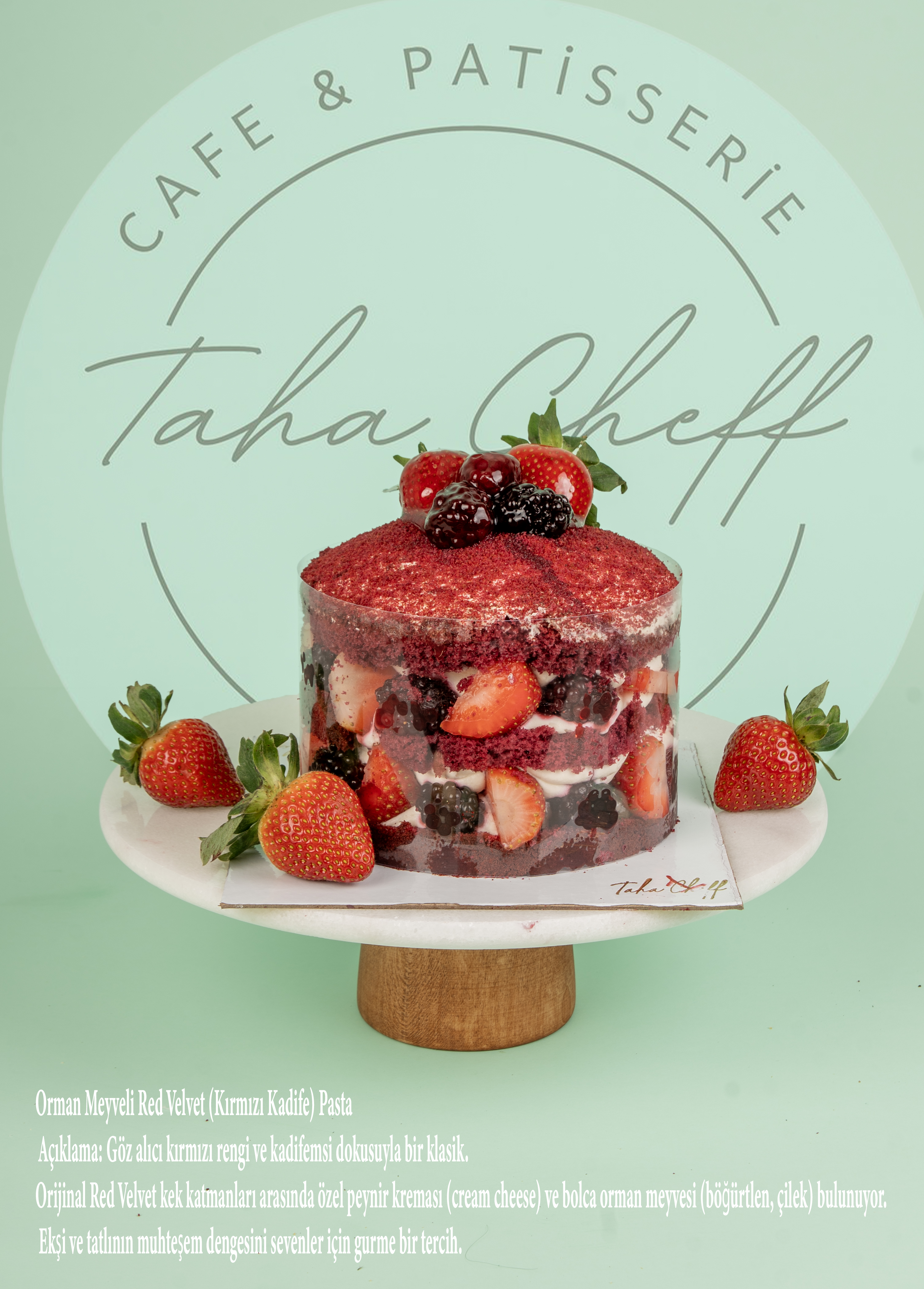 Açıklama: Göz alıcı kırmızı rengi ve kadifemsi dokusuyla bir klasik. Orijinal Red Velvet kek katmanları arasında özel peynir kreması (cream cheese frosting) ve bolca orman meyvesi (böğürtlen, çilek) bulunuyor. Ekşi ve tatlının muhteşem dengesini sevenler için gurme bir tercih.