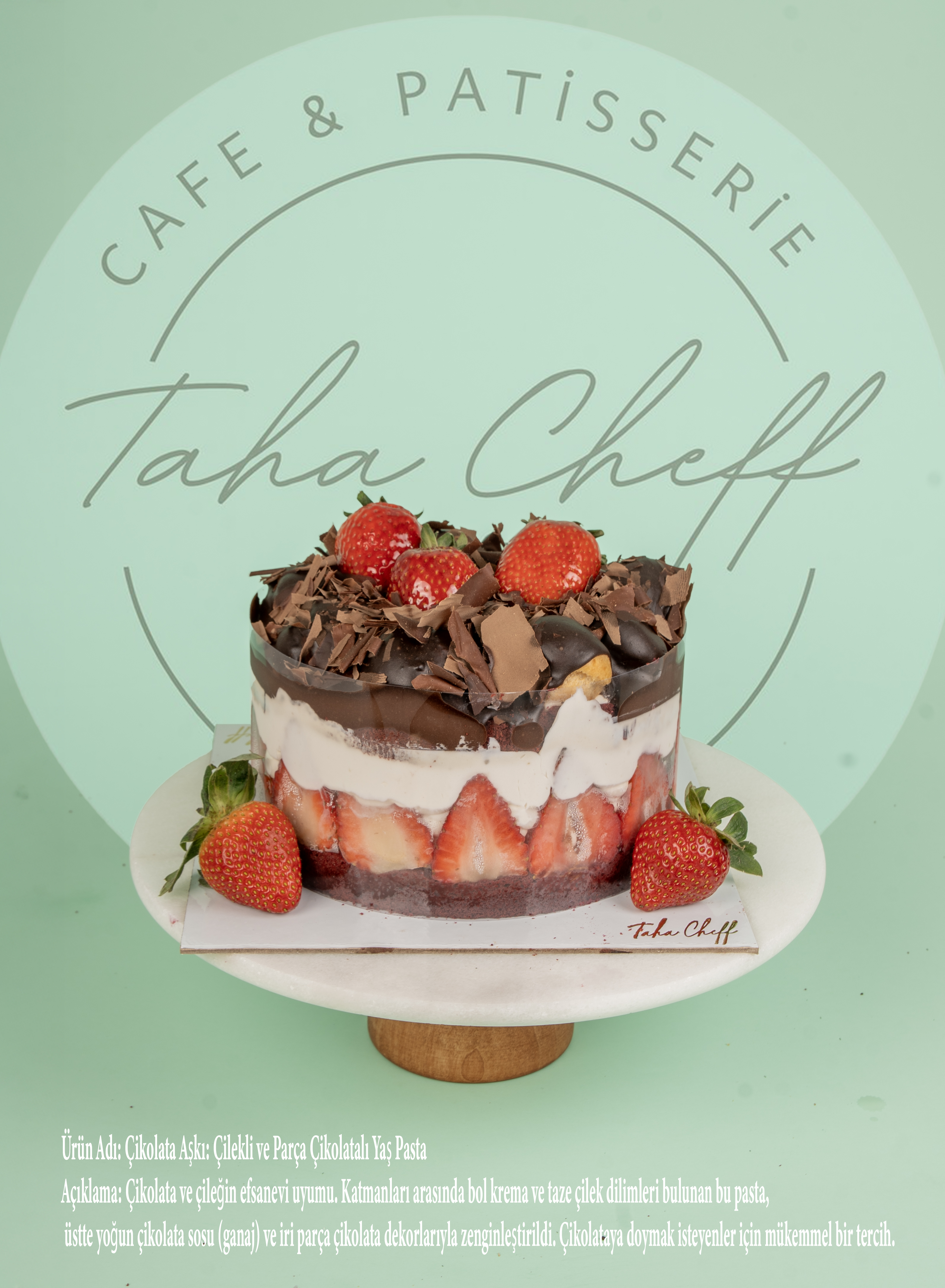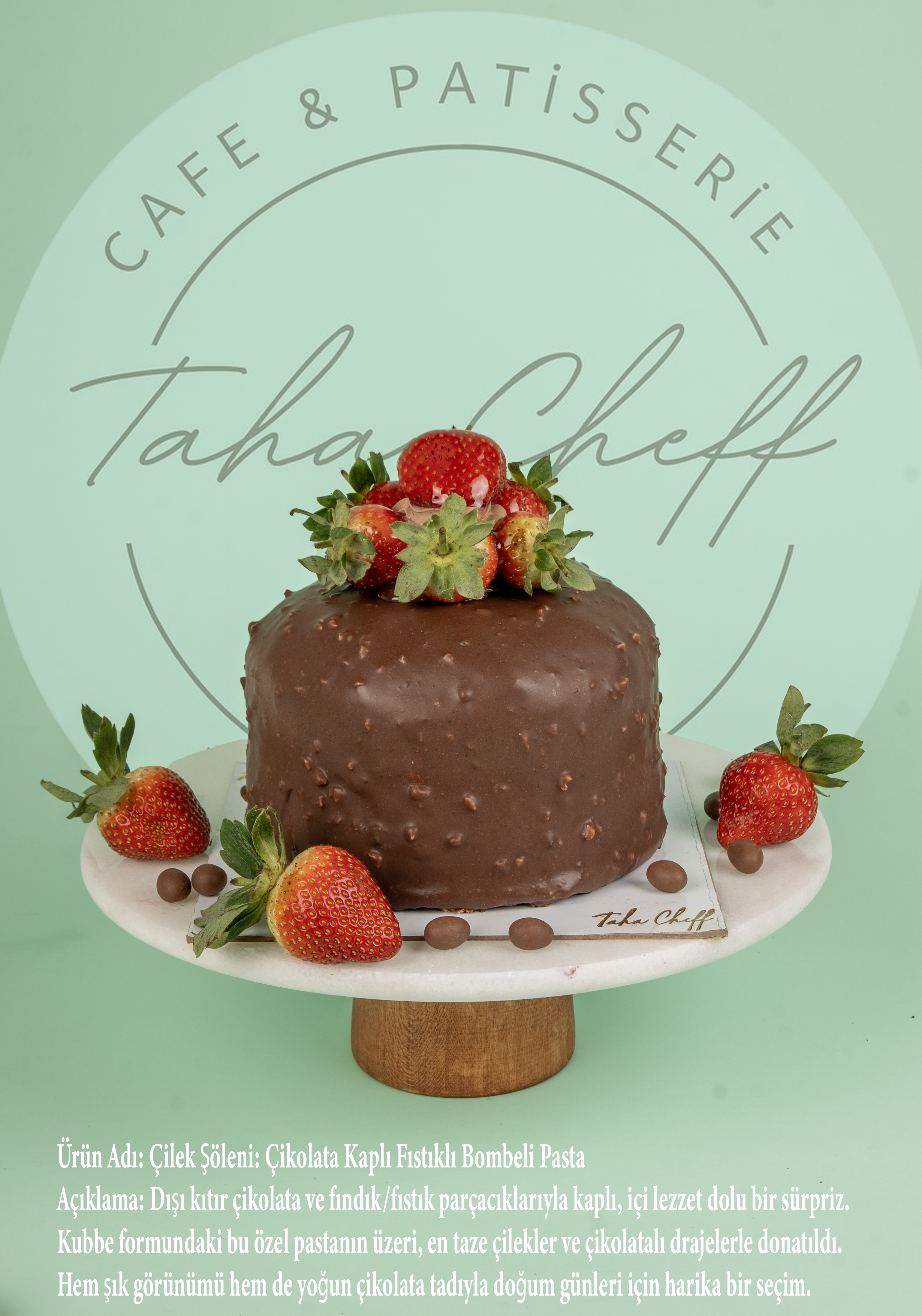 Açıklama: Çikolatada sınır tanımayanlara. Dışı tamamen çıtır bitter çikolata yapraklarıyla (rendeleriyle) kaplı. İçindeki yumuşak doku, dışındaki çıtırlıkla harika bir tezat oluşturuyor. Üzerindeki taze çilek ve özel yeşil makaron ile premium bir pasta deneyimi.